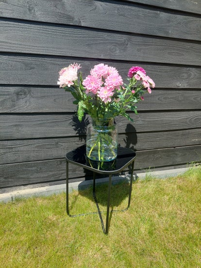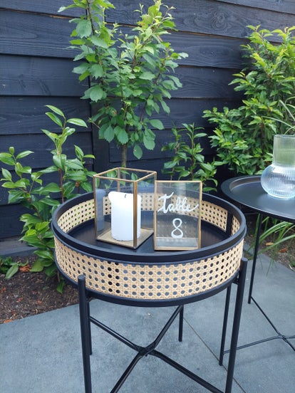 Dit tafeltje staat leuk naast een trouwbankje voor het bruidsboeket, voor bij het gastenboek of bij het welkomstbord met leuke windlichten er op. Het blad is van spiegelglas wat een chique touch geeft aan het geheel.